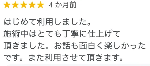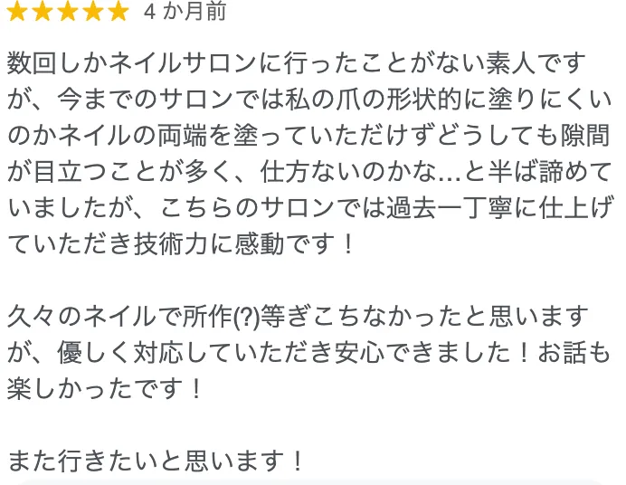 実際に施術を受けられたお客様の声を紹介いたします。初めて利用される方は「料金はいくらなのか」「サロンやネイリストの雰囲気はどうか」など、様々な不安を持たれるのではないでしょうか。初めてのご利用を検討されている方は、ぜひ参考にしていただき、来店いただく際の参考にしてください。お客様一人ひとりの声を大切にし、より良いサービスを提供できるよう日々努力しております。